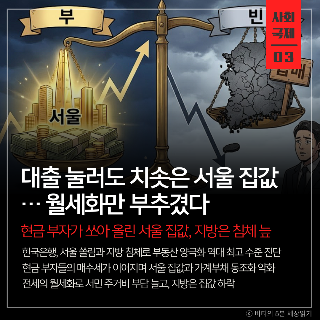 한국은행이 서울과 지방의 부동산 시장 양극화가 사상 최고 수준으로 벌어졌다고 진단했습니다. 대출 규제에도 불구하고 현금 동원력을 갖춘 자산가들이 서울로 몰리며 집값을 끌어올리고 있다는 분석입니다.
