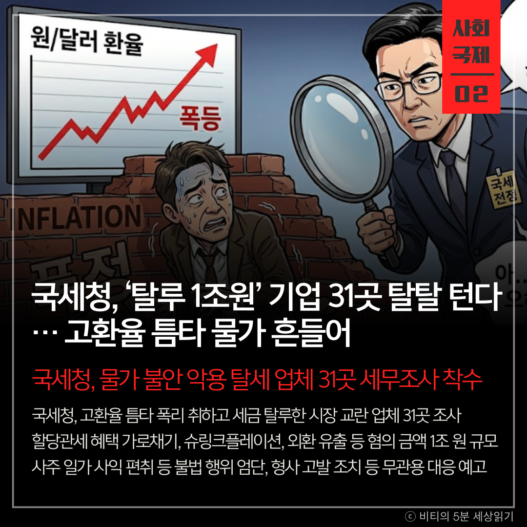 고환율과 고물가로 서민들이 고통받는 상황에서 가격 담합, 슈링크플레이션, 관세 혜택 악용 등으로 폭리를 취한 시장 교란 사업자 31곳이 국세청의 타깃이 되었습니다. 포착된 탈루 혐의 금액만 1조 원에 달합니다.
