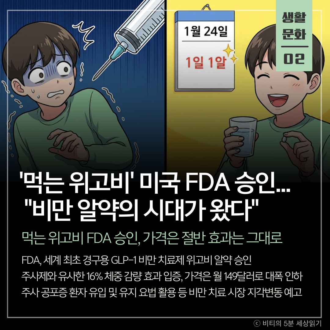 노보노디스크의 비만 치료제 위고비가 주사제가 아닌 알약 형태로 미국 FDA 승인을 받았습니다. 주사제와 대등한 체중 감량 효과를 보이면서도 가격은 절반 수준이라 비만 치료 시장의 판도가 뒤집힐 전망입니다.