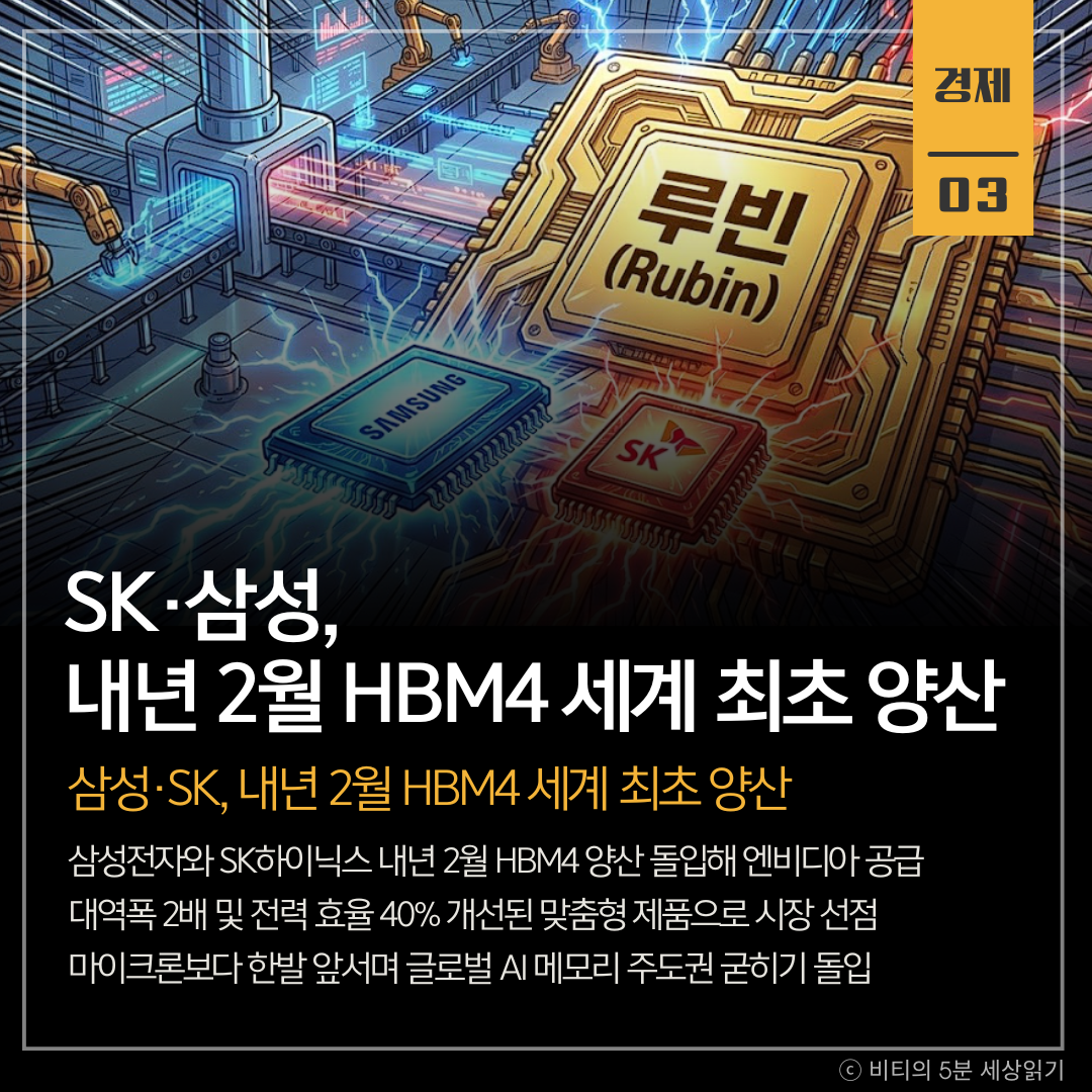 삼성전자와 SK하이닉스가 내년 2월 세계 최초로 6세대 HBM인 'HBM4' 양산에 돌입합니다. 엔비디아의 차세대 칩 '루빈'에 탑재될 예정으로, 한국 반도체가 글로벌 AI 메모리 시장의 주도권을 더욱 공고히 할 전망입니다.