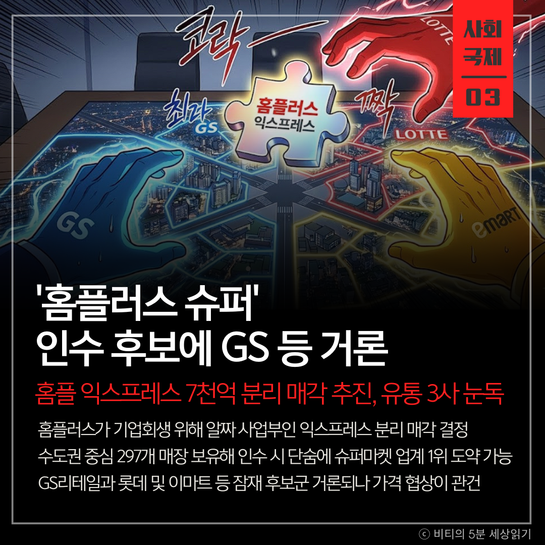 - 매물 가치: 홈플러스 익스프레스는 전국 297개 매장을 보유하고 있으며, 이 중 80%가 수도권 요지에 위치합니다. 퀵커머스(즉시 배송) 시스템도 잘 갖춰져 있어 매년 1조 2,000억 원의 매출을 올리는 알짜 사업부입니다.