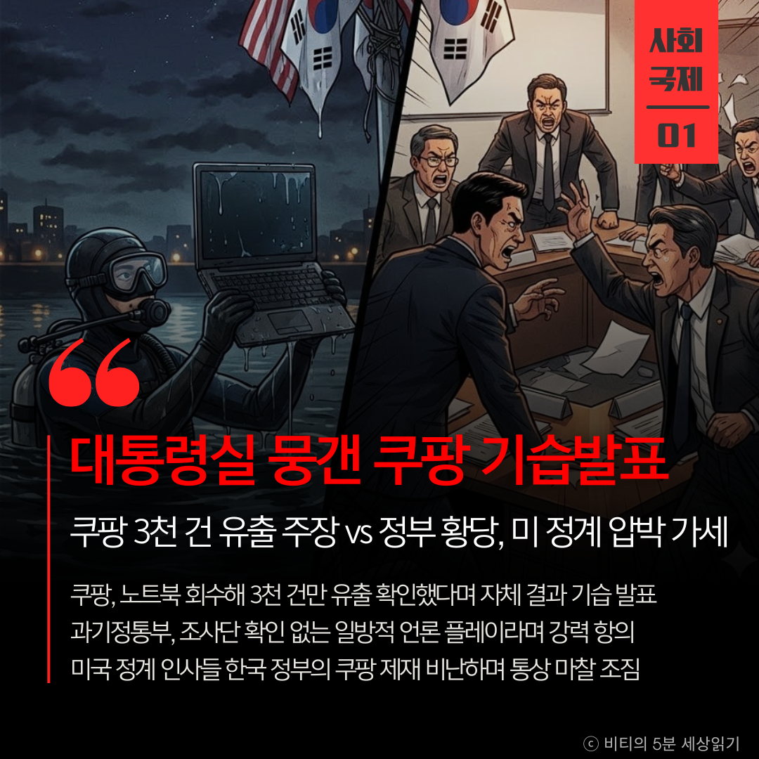 쿠팡의 대응이 마치 첩보 영화 같습니다. 하천에 던진 노트북을 잠수부가 건져내 포렌식 했다는 주장은 극적이지만, 객관적인 검증이 빠져 있어 정부의 신뢰를 얻지 못하고 있습니다. 더 큰 문제는 이 사안이 한미 통상 갈등으로 번지고 있다는 점입니다. 소비자 피해 구제라는 본질이 외교적 힘겨루기에 묻히지 않도록, 철저하고 투명한 팩트 체크가 우선되어야 합니다.
