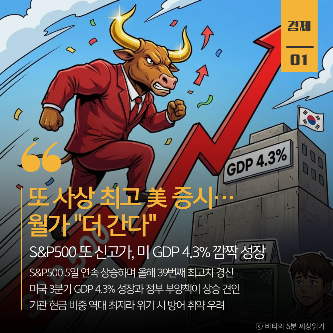 미국 S&P500 지수가 올해만 39번째 사상 최고치를 경신했습니다. 3분기 GDP가 4.3% 성장하는 등 탄탄한 경제 지표와 정부의 주가 부양 의지가 맞물린 결과입니다. 다만 기관 투자자들의 현금 비중이 역대 최저 수준이라 위기 시 충격이 클 수 있다는 우려도 나옵니다.