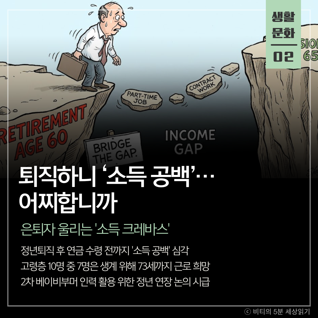 법정 정년(60세)과 국민연금 수급 연령(63~65세)의 불일치로 인한 소득 공백기, 이른바 '소득 크레바스'가 중장년층을 다시 일터로 내몰고 있다. 2차 베이비부머 세대의 은퇴가 본격화됨에 따라 정년 연장과 재고용 등 제도적 보완이 시급하다는 지적이다.