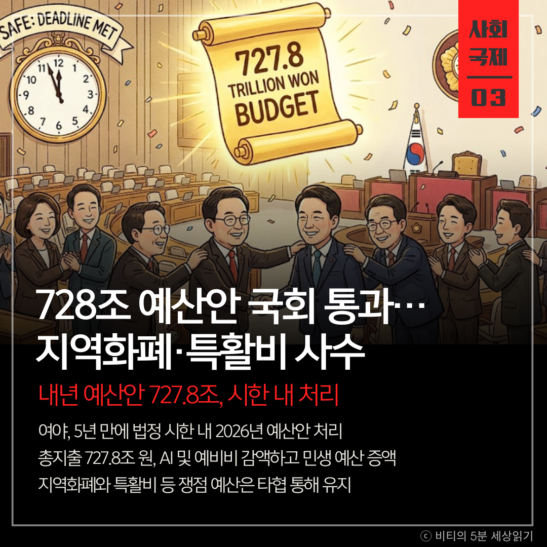 여야가 5년 만에 법정 시한 내에 내년도 예산안을 처리했다. 총지출은 727조 8천억 원 규모로 정부안에서 소폭 감액되었으나, 이재명 정부의 핵심 국정과제인 지역사랑상품권과 대통령실 특활비 등은 대부분 유지되었다.