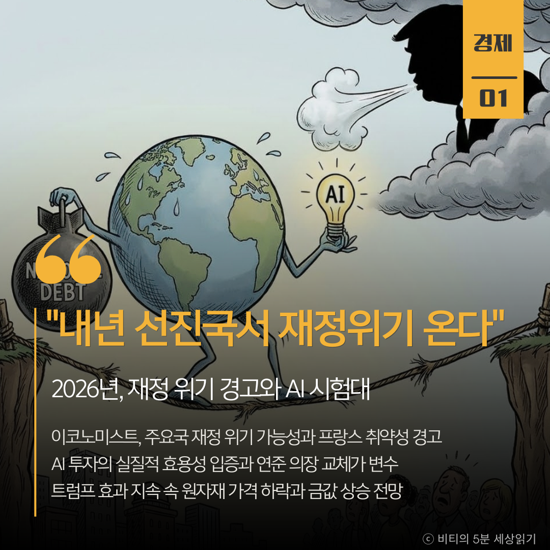 영국 경제주간지 이코노미스트는 2026년 주요국 중 한 곳에서 재정 위기가 발생할 수 있다고 경고하며 프랑스를 취약국으로 꼽았다. 또한 AI가 실질적인 생산성을 증명해야 하는 시기이며, 연준 의장 교체에 따른 금융시장 혼란 가능성도 제기했다.