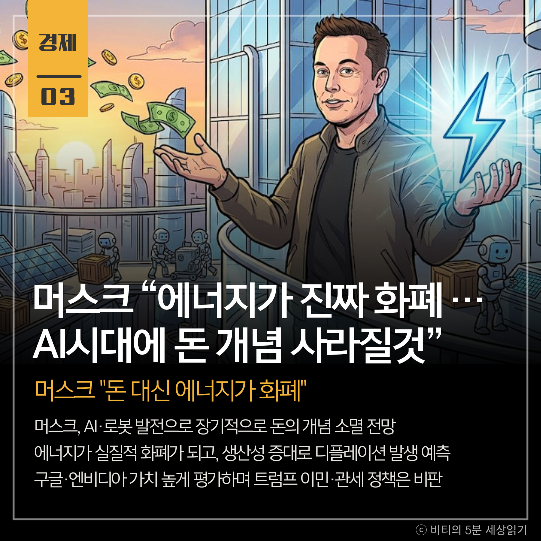 '돈'이 아닌 '에너지'가 부의 척도가 되는 세상, 공상과학 영화 같은 이야기지만 머스크의 통찰은 늘 시대를 앞서갔습니다. 노동과 자본의 의미가 재정의되는 AI 시대, 우리는 무엇을 준비해야 할까요?