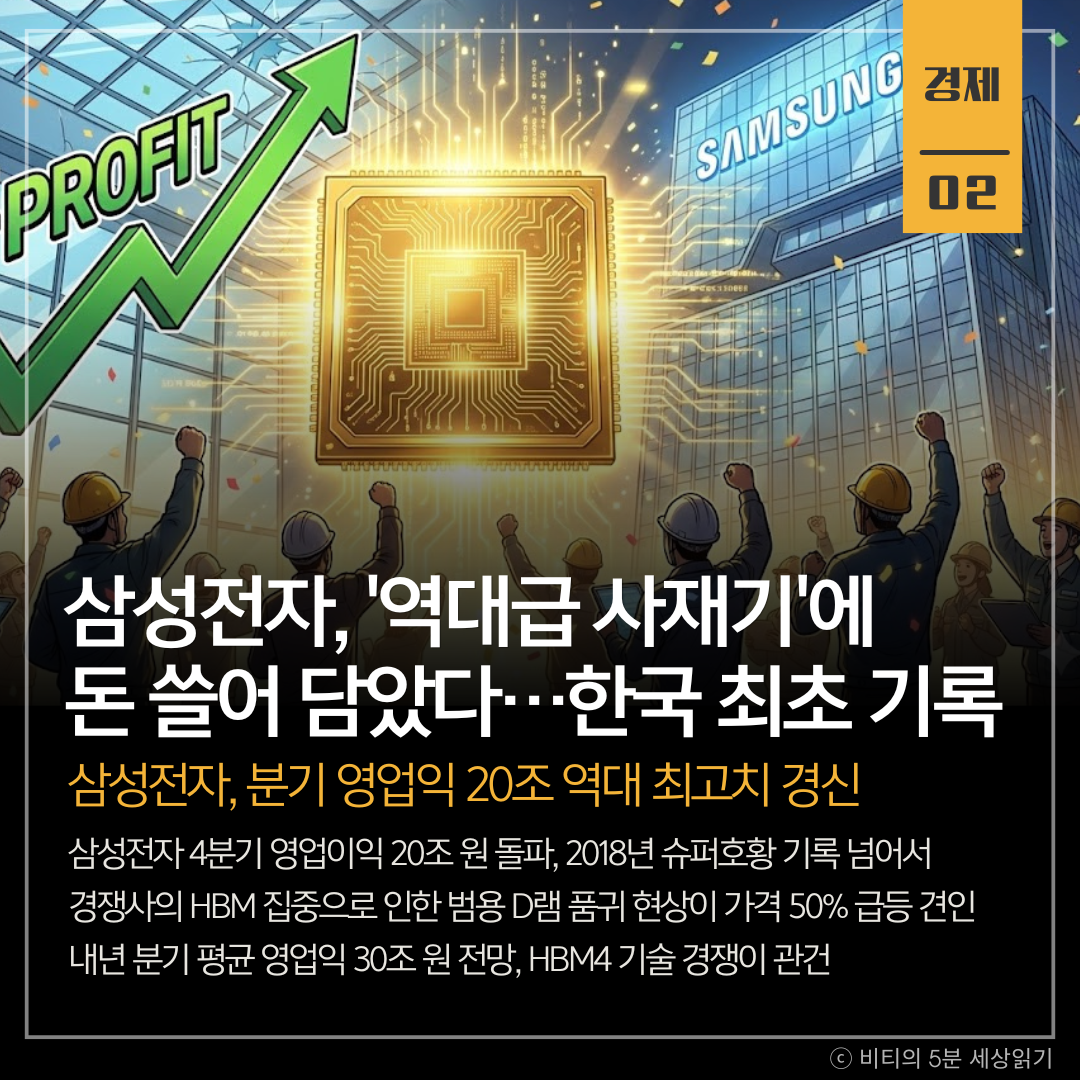 삼성전자가 올해 4분기 영업이익 20조 원을 넘어서며 창사 이래 최대 분기 실적을 달성했습니다. AI 열풍으로 범용 D램 가격이 50% 가까이 급등하고, HBM(고대역폭메모리) 공급이 본격화되면서 '제2의 반도체 슈퍼사이클'에 진입했다는 분석입니다.