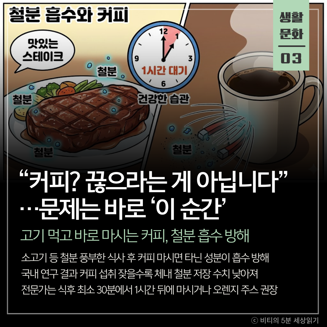 한국인의 국룰인 식후 아이스 아메리카노가 사실은 내 몸의 철분을 뺏어가는 주범이었습니다. 입안의 개운함만 쫓다가 빈혈을 얻을 수 있다는 경고입니다. 특히 철분이 부족하기 쉬운 여성이나 빈혈 환자는 식습관을 점검해야 합니다. 커피를 끊을 필요는 없습니다. 그저 식사 후 1시간만 참았다가 마시는 타이밍의 지혜가 필요합니다.