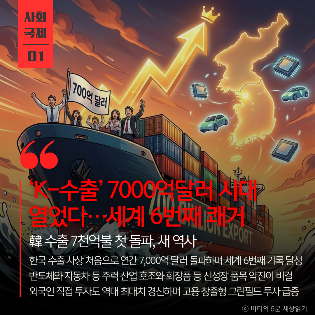 우리나라 연간 수출액이 사상 처음으로 7,000억 달러를 넘어섰습니다. 반도체와 자동차 등 주력 산업의 뒷심과 역대 최대 규모의 외국인 직접 투자가 맞물려, 글로벌 통상 위기 속에서도 세계 6번째로 7,000억 달러 클럽에 가입했습니다.