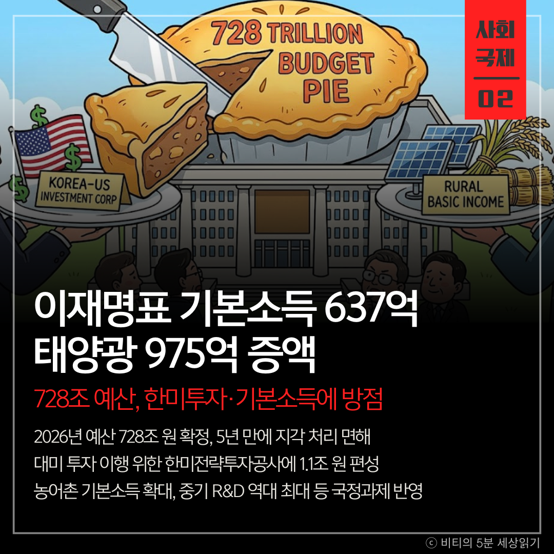 국회가 정부안 대비 1268억 원 줄어든 727조 9000억 원 규모의 2026년도 예산안을 확정했다. 대미 투자 약속 이행을 위한 '한미전략투자공사' 설립에 1조 원 넘게 투입하고, 이재명 정부의 핵심인 농어촌 기본소득과 재생에너지 사업 예산을 늘린 것이 특징이다.