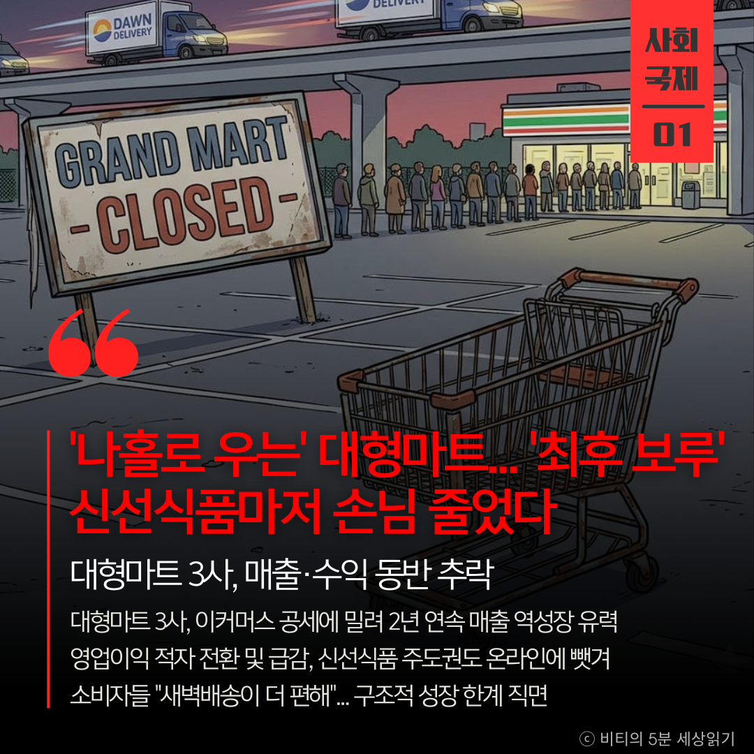 국내 유통의 중심이었던 대형마트 3사가 구조적 침체기에 접어들었다. 이커머스의 새벽배송과 편의점의 약진 속에 대형마트는 올해 합산 매출이 20조 원을 간신히 넘길 것으로 보이며, 영업이익 또한 적자를 기록하거나 급감하는 등 생존 위기에 직면했다.