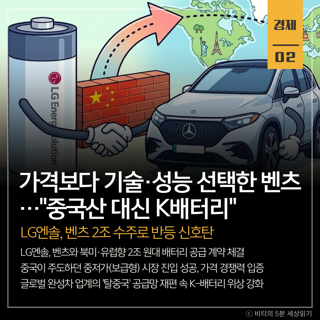LG에너지솔루션이 메르세데스-벤츠와 약 2조 원 규모의 대형 배터리 공급 계약을 맺었다. 이번 계약은 LG가 그동안 주력해 온 고성능 배터리가 아닌, 보급형(중저가) 모델에 탑재될 물량으로 추정된다. 이는 중국 업체들이 장악하던 중저가 시장에서 LG가 기술력은 물론 '가격 경쟁력'까지 입증했다는 의미로, 글로벌 '탈중국' 기조와 맞물려 K-배터리의 반등 신호탄이 될 전망이다.