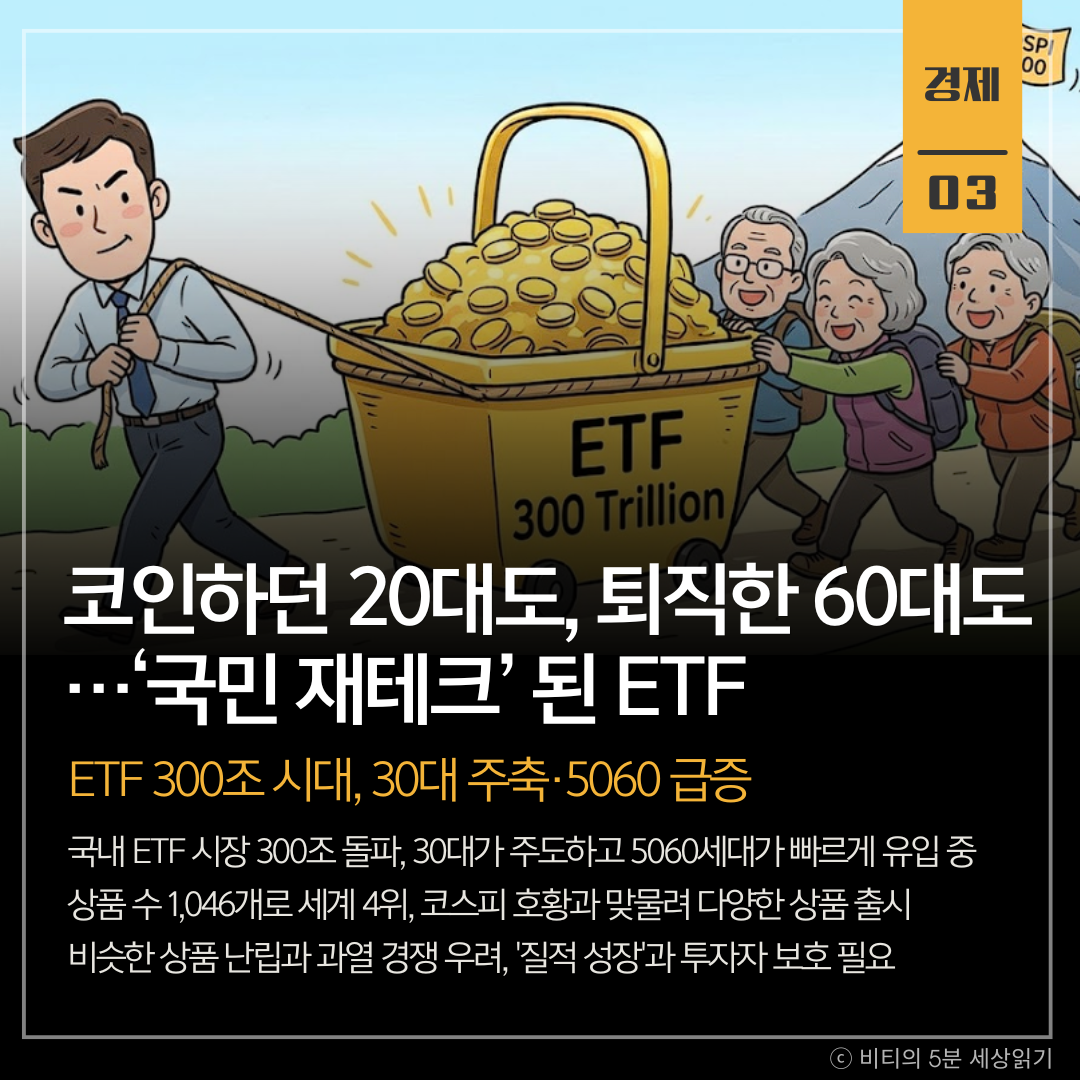 2025년 현재, 코스피 4,000시대를 맞아 국내 ETF(상장지수펀드) 시장이 순자산 300조 원을 돌파했다. 적은 돈으로 분산 투자가 가능한 장점 덕분에 30대가 핵심 투자층으로 자리 잡았고, 안정성을 선호하는 5060세대의 유입도 가파르다. 다만, 운용사 간 베끼기 상품 출시 등 과열 경쟁에 대한 우려도 제기된다.