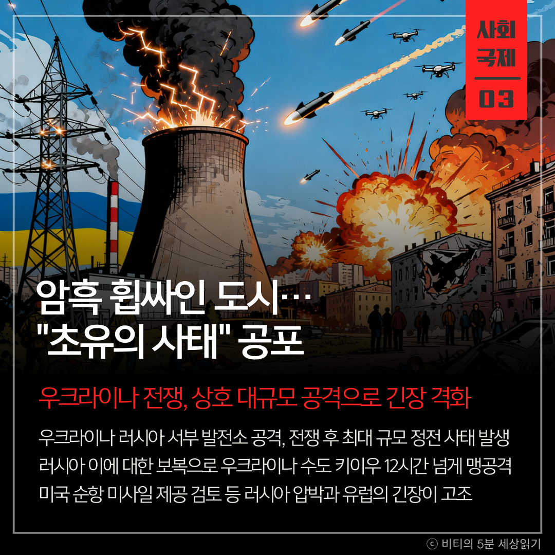 전쟁의 초점이 군사 시설을 넘어 민간 기반 시설을 공격하는 양상으로 바뀌고 있습니다. 순항 미사일 제공 등 서방의 지원이 강화되면서 러시아가 협상 테이블로 나올지, 아니면 확전을 택할지 중대기로에 놓였습니다.