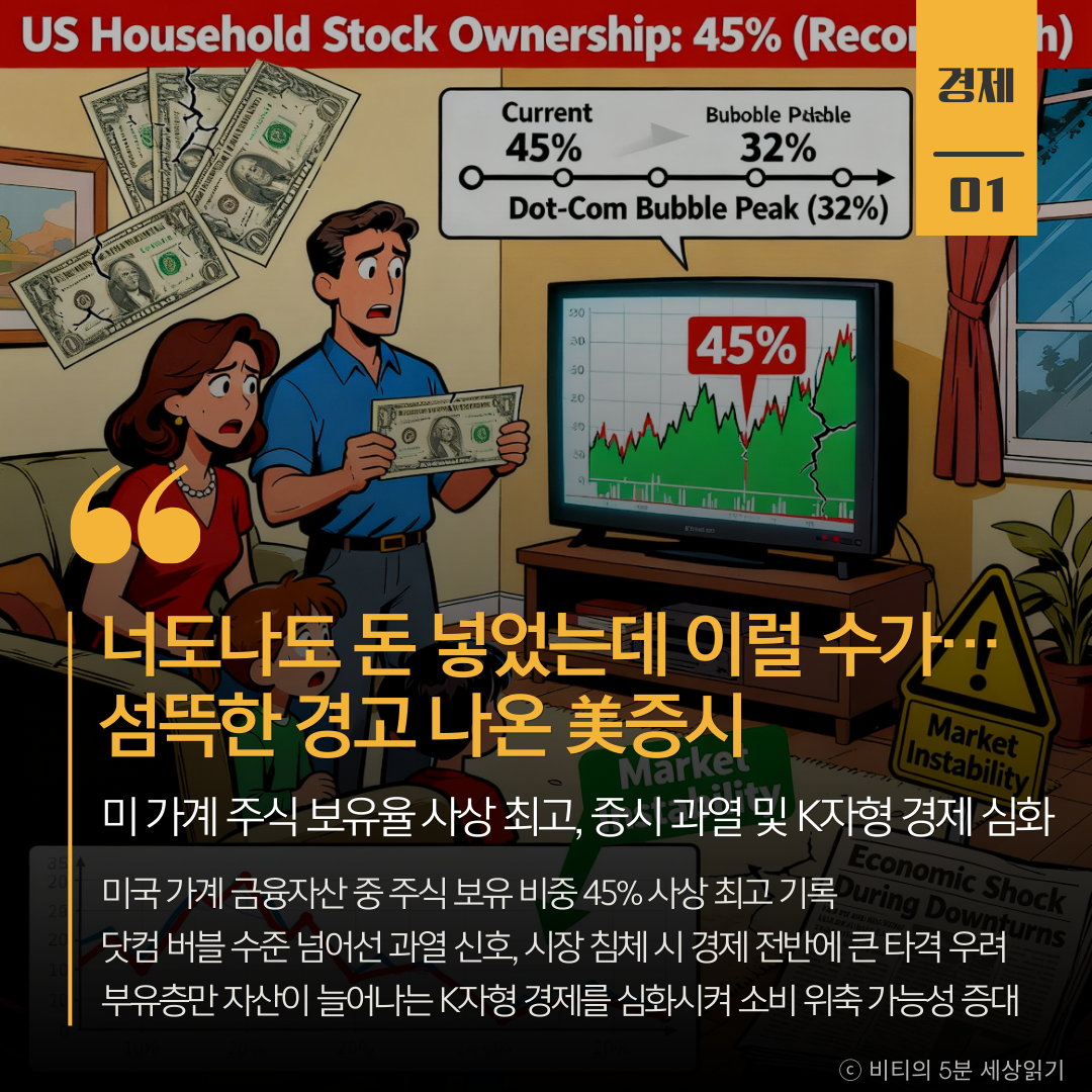 미국 가계의 주식 보유 비중이 사상 최고치를 기록하며 증시 과열 경고가 나왔다. AI 열풍에 힘입어 주가가 고공행진 중이나, 시장 침체 시 부유층의 소비 위축을 통해 K자형 경제 전반에 큰 타격을 줄 수 있다는 분석이다.
