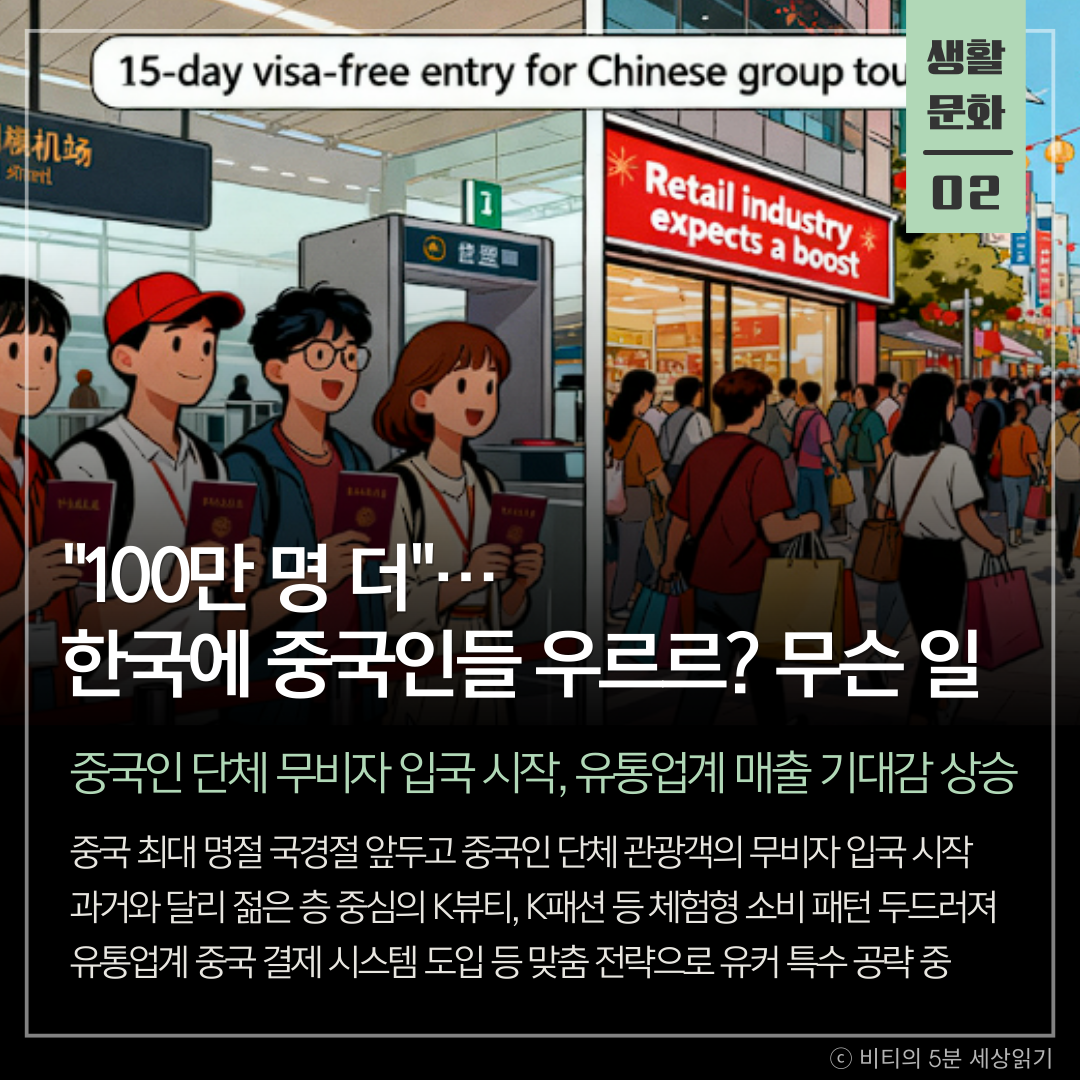 중국 최대 명절 국경절 연휴를 앞두고 중국인 단체 관광객의 무비자 한국 여행이 시작됐다. 면세점 위주였던 과거와 달리 젊은 층을 중심으로 K뷰티, K패션 등 체험형 소비가 늘어날 것으로 예상되며 유통업계의 매출 기대감이 높아지고 있다.