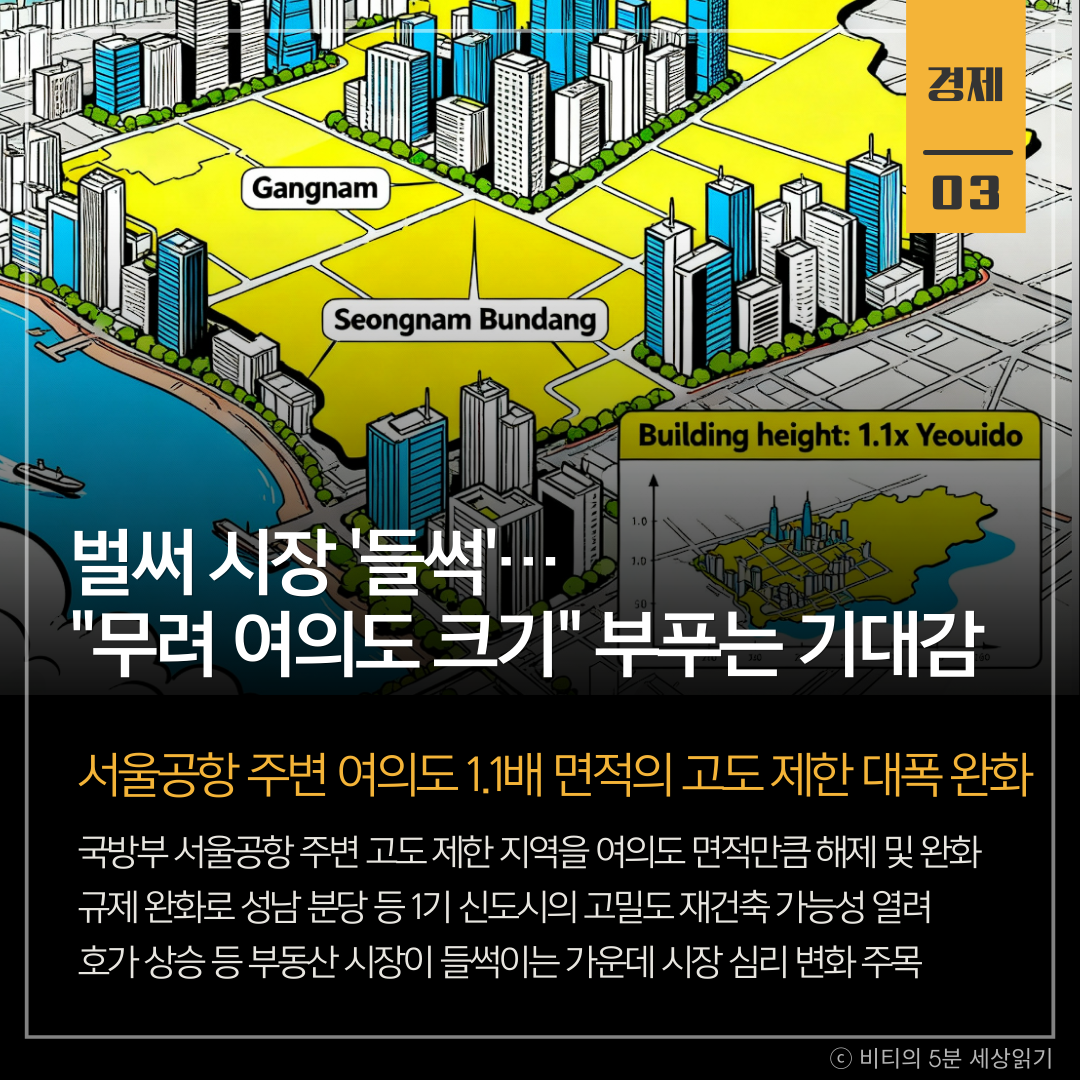 국방부가 서울공항 주변 지역의 비행 안전구역 규제를 해제 및 완화했다. 서울 강남권과 성남시 등 327만㎡의 고도 제한이 대폭 풀리면서, 특히 1기 신도시 재건축이 추진되는 성남 분당을 중심으로 부동산 시장에 큰 영향을 미칠 전망이다.