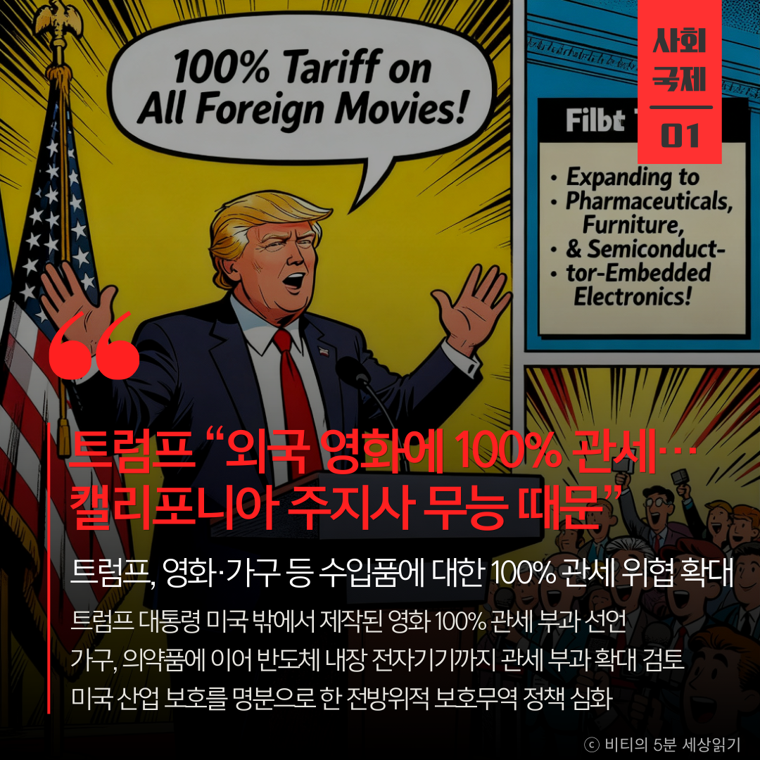도널드 트럼프 미국 대통령의 고율 관세 부과가 영화, 가구 등 광범위한 산업으로 확대되고 있습니다. 트럼프 대통령은 소셜미디어를 통해 미국 밖에서 제작되는 모든 영화에 대해 100% 관세를 부과하겠다고 밝혔습니다. 이는 미국의 영화 제작 산업이 다른 나라에 의해 '도둑맞고 있다'는 인식 때문입니다.