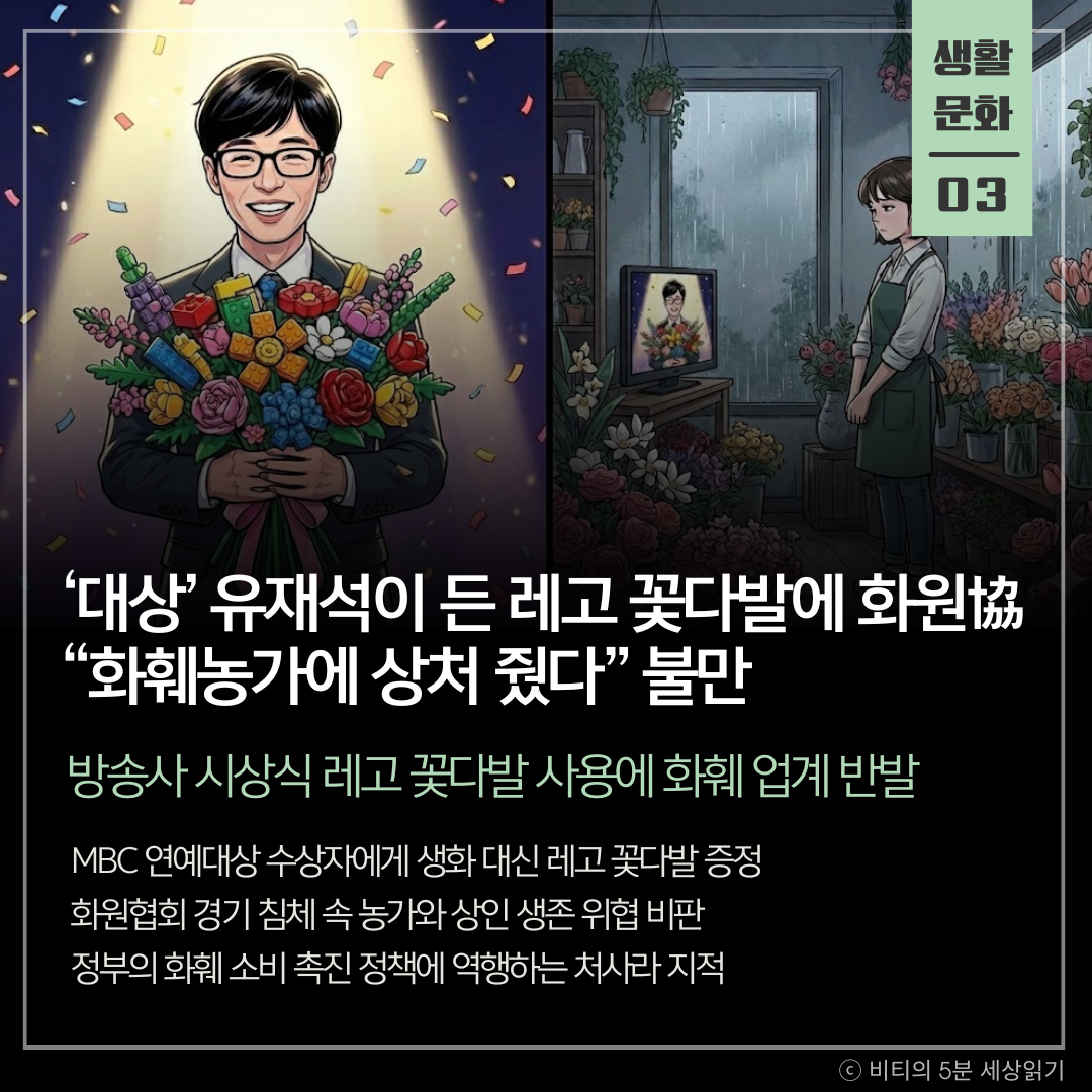 지난해 연말 MBC 방송연예대상에서 수상자들에게 생화 대신 장난감 블록인 '레고 꽃다발'을 전달한 것을 두고, 한국화원협회가 화훼 농가와 종사자들의 생계를 위협하는 행위라며 강한 유감을 표명했습니다.