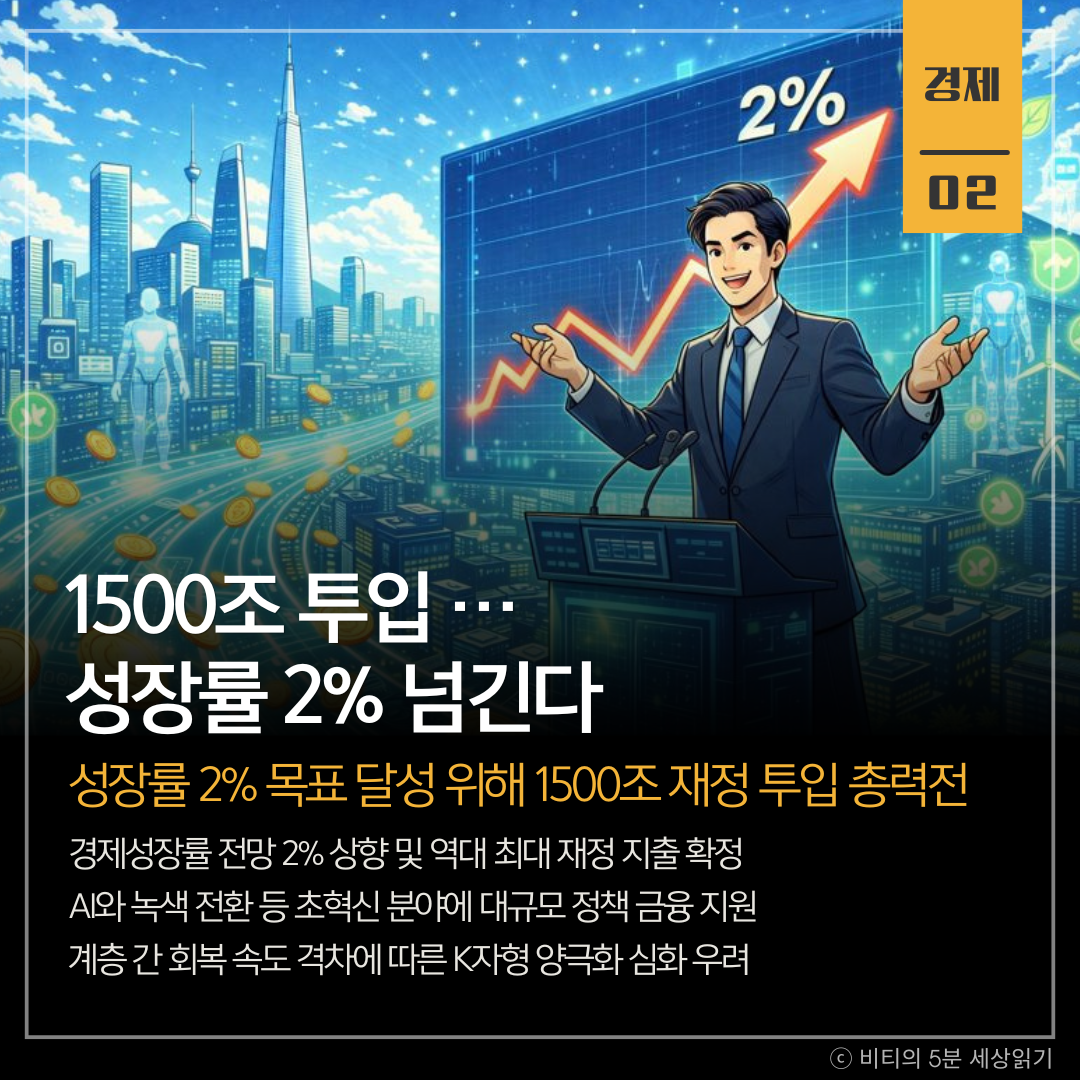1.8%에서 2%로의 상향은 단순한 수치 조정을 넘어, 정부가 가진 모든 '실탄'을 쏟아부어 경제 엔진을 다시 뜨겁게 달구겠다는 선전포고와 같습니다. 1,500조 원이라는 천문학적인 돈이 풀리는 만큼 단기적인 경기 부양 효과는 분명히 있을 것입니다. 하지만 중요한 것은 그 온기가 대기업과 첨단 산업을 넘어 서민 경제의 말초신경까지 전달되느냐입니다. '성장'이라는 화려한 숫자 뒤에 가려질 수 있는 양극화의 그늘을 얼마나 세심하게 보듬느냐가 이번 정책 성공의 진짜 열쇠가 될 것입니다.
