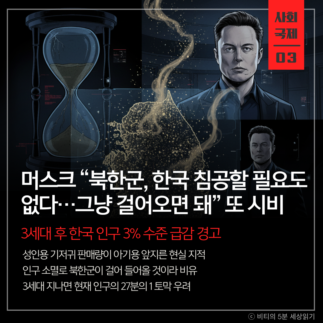 세계적인 혁신가의 입에서 나온 "북한이 그냥 걸어오면 된다"는 말은 듣기에 따라 매우 모욕적이고 섬뜩하게 들립니다. 하지만 불쾌감을 넘어 우리가 뼈저리게 받아들여야 할 것은 제3자의 눈에 비친 한국의 미래가 그만큼 절망적이라는 사실입니다. 인구 문제는 이제 단순한 사회 현상을 넘어 국가의 생존과 직결된 안보 위협이 되었습니다. 특단의 대책 없이는 그의 예언이 현실이 될지도 모릅니다.