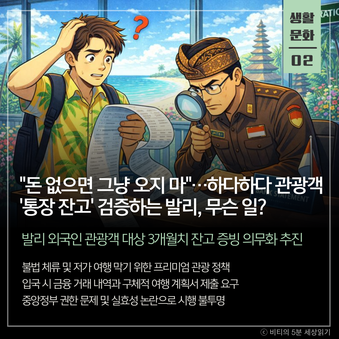 인도네시아 발리 지방정부가 외국인 관광객에게 최근 3개월간의 은행 계좌 잔고 증빙 제출을 의무화하는 방안을 추진합니다. 무분별한 저예산 여행을 막고 '프리미엄 관광'을 활성화하겠다는 취지입니다.