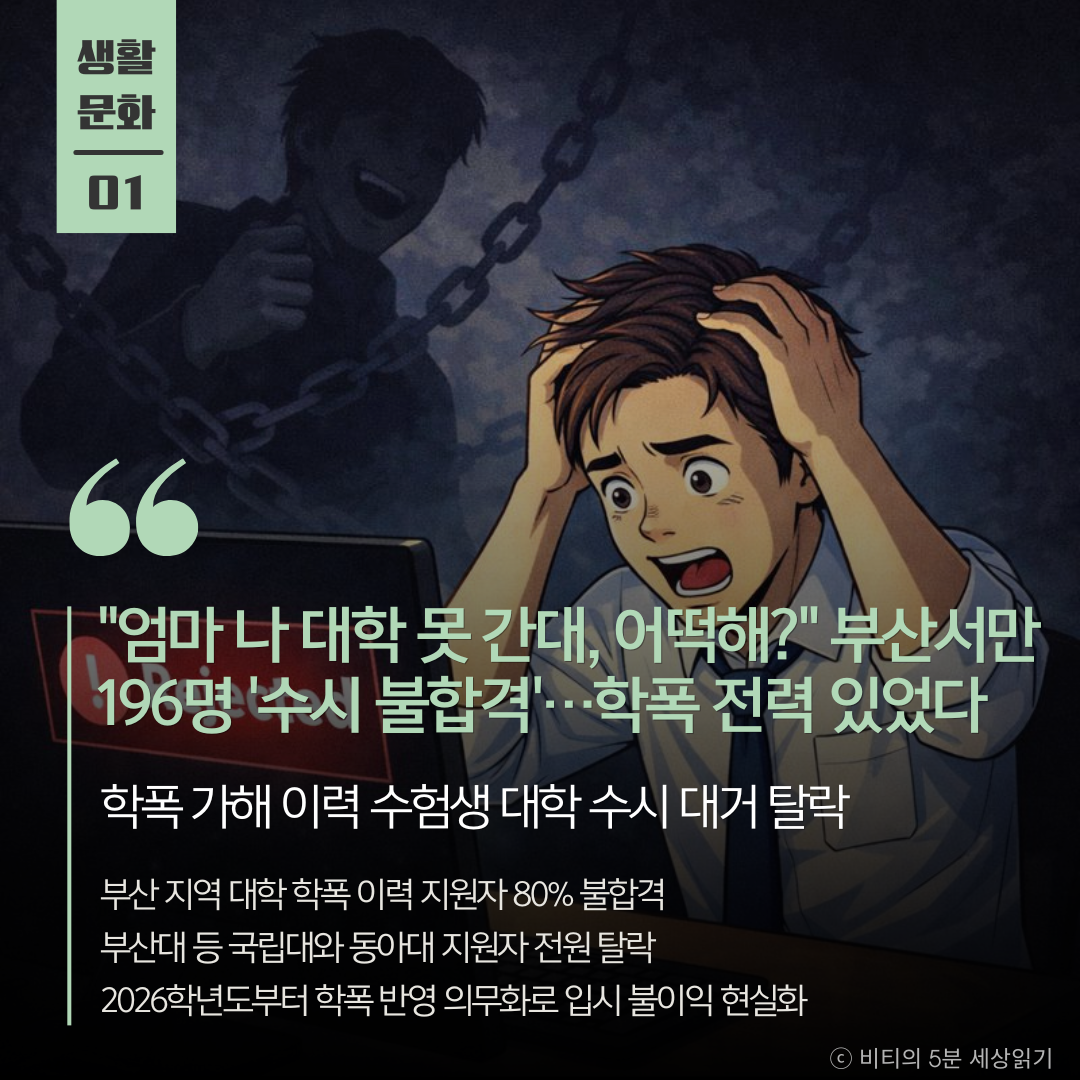 2026학년도 대입부터 학교폭력 조치 사항 반영이 의무화되면서 부산 지역 대학 수시모집에서 학폭 가해 이력이 있는 지원자 약 80%가 불합격했습니다. 특히 주요 국립대와 일부 사립대에서는 지원자가 전원 탈락하는 등 강력한 불이익이 현실화되었습니다.