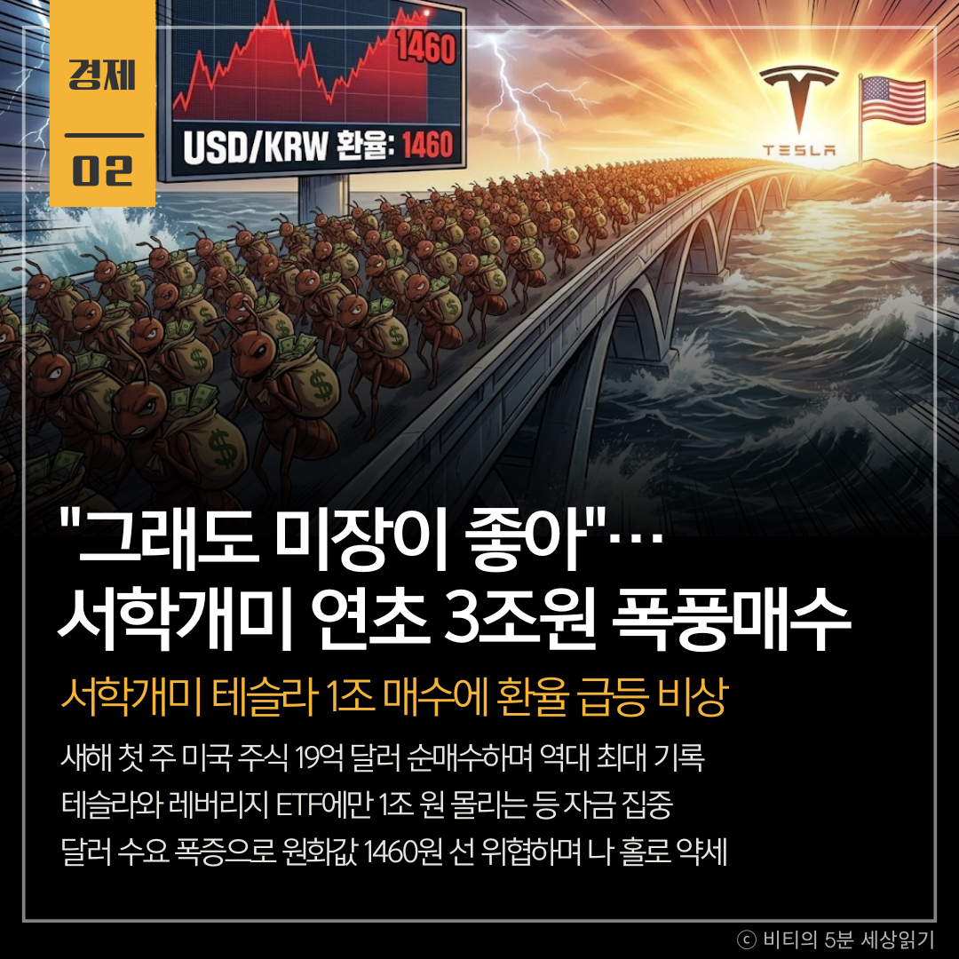 새해 첫 주 서학개미들이 3조 원 가까이 미국 주식을 사들이며 역대급 매수세를 보였습니다. 특히 테슬라에만 1조 원이 몰렸고, 이로 인한 달러 수요 폭증으로 원·달러 환율이 다시 1,460원 선을 위협하고 있습니다.