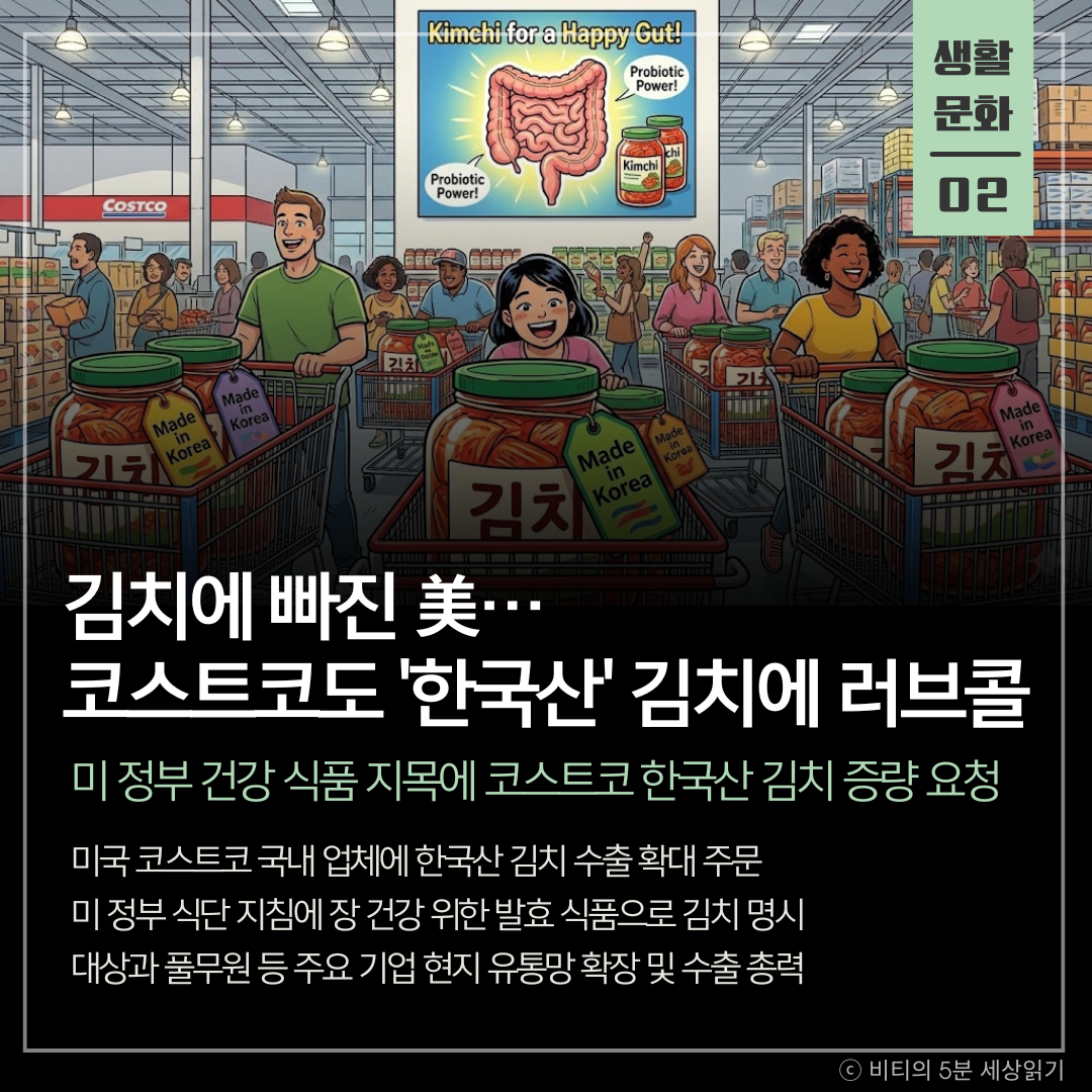 미국 최대 창고형 할인점 코스트코가 최근 국내 주요 식품 업체들에게 미국 현지 생산이 아닌, 한국에서 직접 만든 '메이드 인 코리아' 김치의 수출 물량을 늘려달라고 공식 요청했습니다. 원재료부터 생산 공정까지 한국의 오리지널리티가 담긴 제품을 선호하는 현상이 뚜렷해진 것입니다. 이는 최근 미국 정부가 발표한 식단 가이드라인에서 장 건강을 위해 채소, 과일과 함께 김치 등 발효 식품 섭취를 적극 권장한 것이 결정적인 계기가 되었습니다.