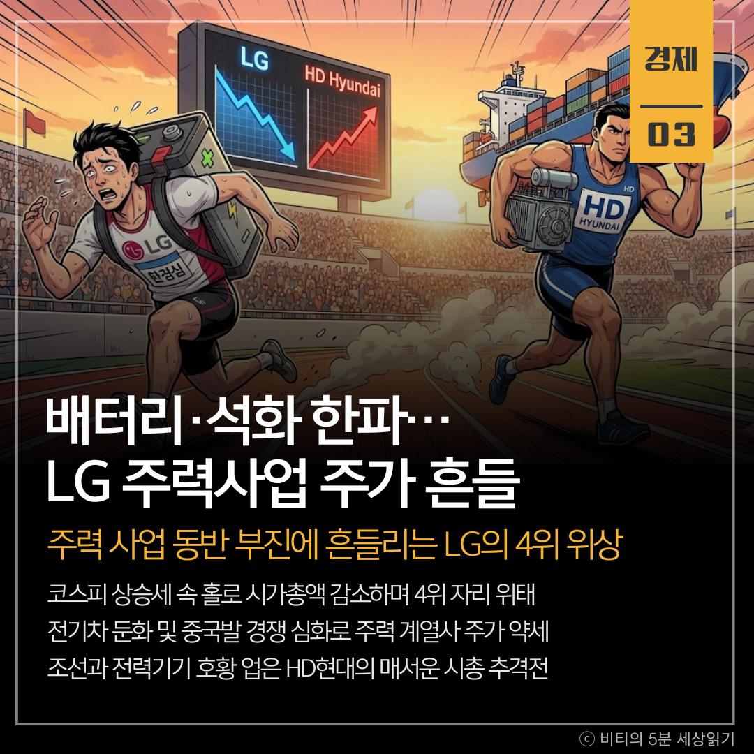 새해 들어 코스피가 상승하는 동안 5대 그룹 중 유일하게 LG그룹의 시가총액만 감소했습니다. 주력 계열사의 전반적인 실적 부진 속에 호황을 맞은 5위 HD현대가 턱밑까지 추격하며 LG의 재계 시총 4위 자리마저 위태로운 상황입니다.
