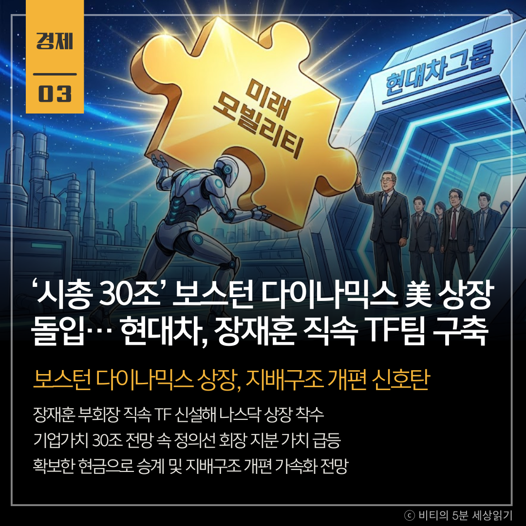 현대차그룹이 보스턴 다이나믹스의 미국 나스닥 상장을 위해 장재훈 부회장 직속으로 '사업기획 TFT'를 신설했습니다. TF장은 전상태 부사장이 맡았으며, 전략투자와 M&A 전문가들이 대거 합류해 상장 준비에 돌입했습니다. 올 초 CES 2026에서 휴머노이드 로봇 '아틀라스'를 선보인 이후, 시장에서는 보스턴 다이나믹스의 기업가치를 최소 30조 원 이상으로 평가하고 있습니다.