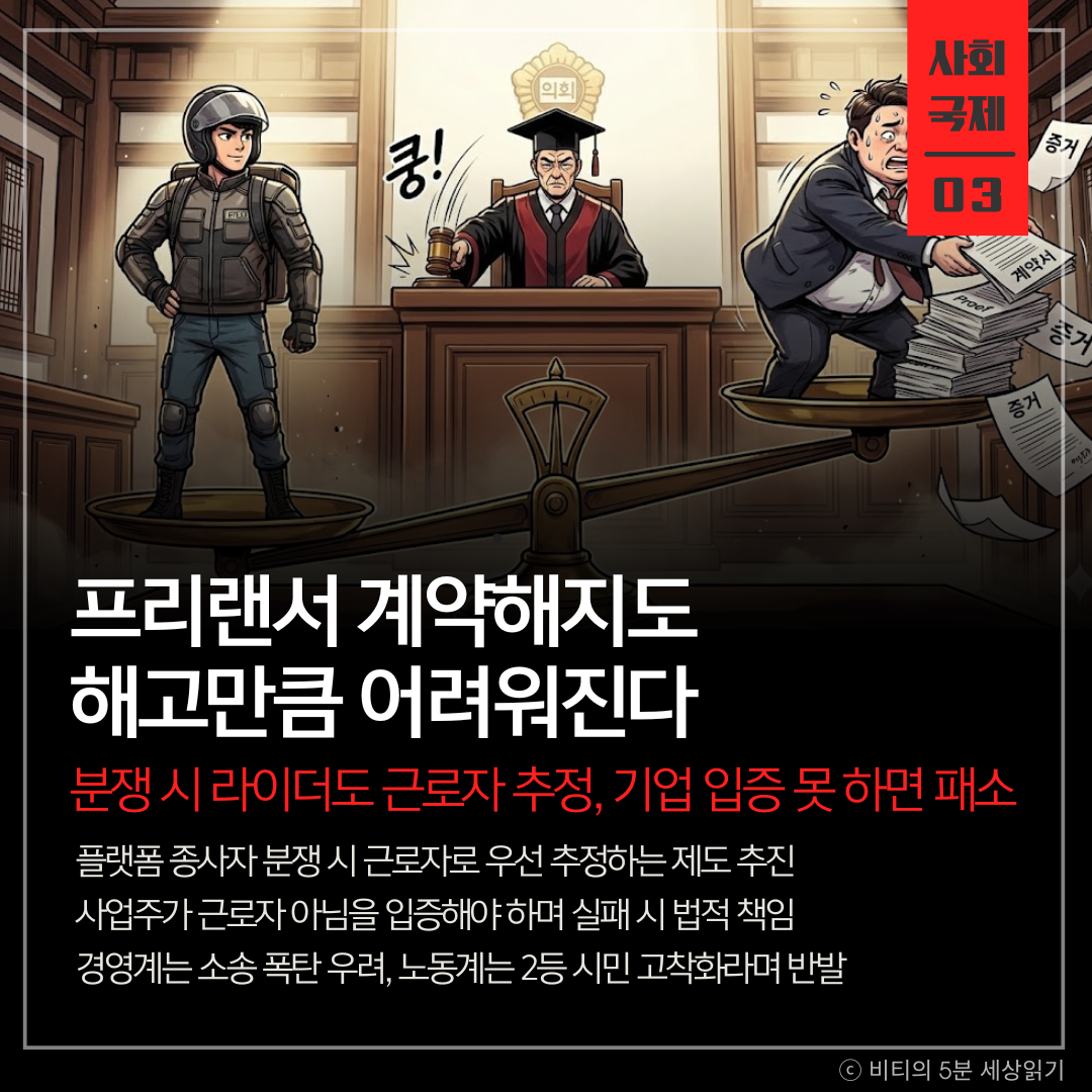 정부가 배달 라이더 등 플랫폼 종사자가 분쟁 시 일단 '근로자'로 추정받도록 법을 개정하며, 노동자 아님을 입증할 책임을 사업주에게 넘기는 파격적인 노동 개혁을 추진합니다.