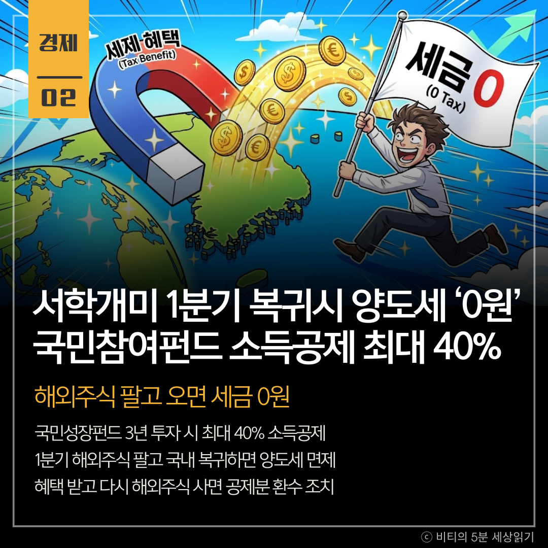 해외주식 투자자들을 위한 당근책도 마련됐습니다. '국내시장 복귀계좌(RIA)'를 통해 해외주식을 팔고 그 돈을 국내 증시에 1년간 투자하면, 매도 금액 5,000만 원 한도 내에서 양도소득세를 깎아줍니다. 특히 1분기 내에 매도하고 돌아오면 세금을 100% 감면받을 수 있습니다.