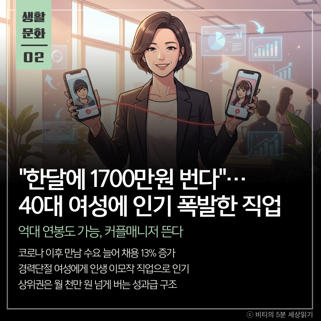 커플매니저는 회원 가입을 돕는 '상담매니저'와 만남을 주선하는 '매칭매니저'로 나뉩니다. 결혼과 육아 경험이 있는 중년 여성이나 영업직 출신이 선호되며, 진입 장벽이 비교적 낮아 경력단절 여성들의 재취업 경로로 인기입니다. 수익 구조는 기본급에 인센티브를 더하는 방식이라, 상위권 매니저는 월 1,000만 원 이상의 고수익을 올리기도 합니다.