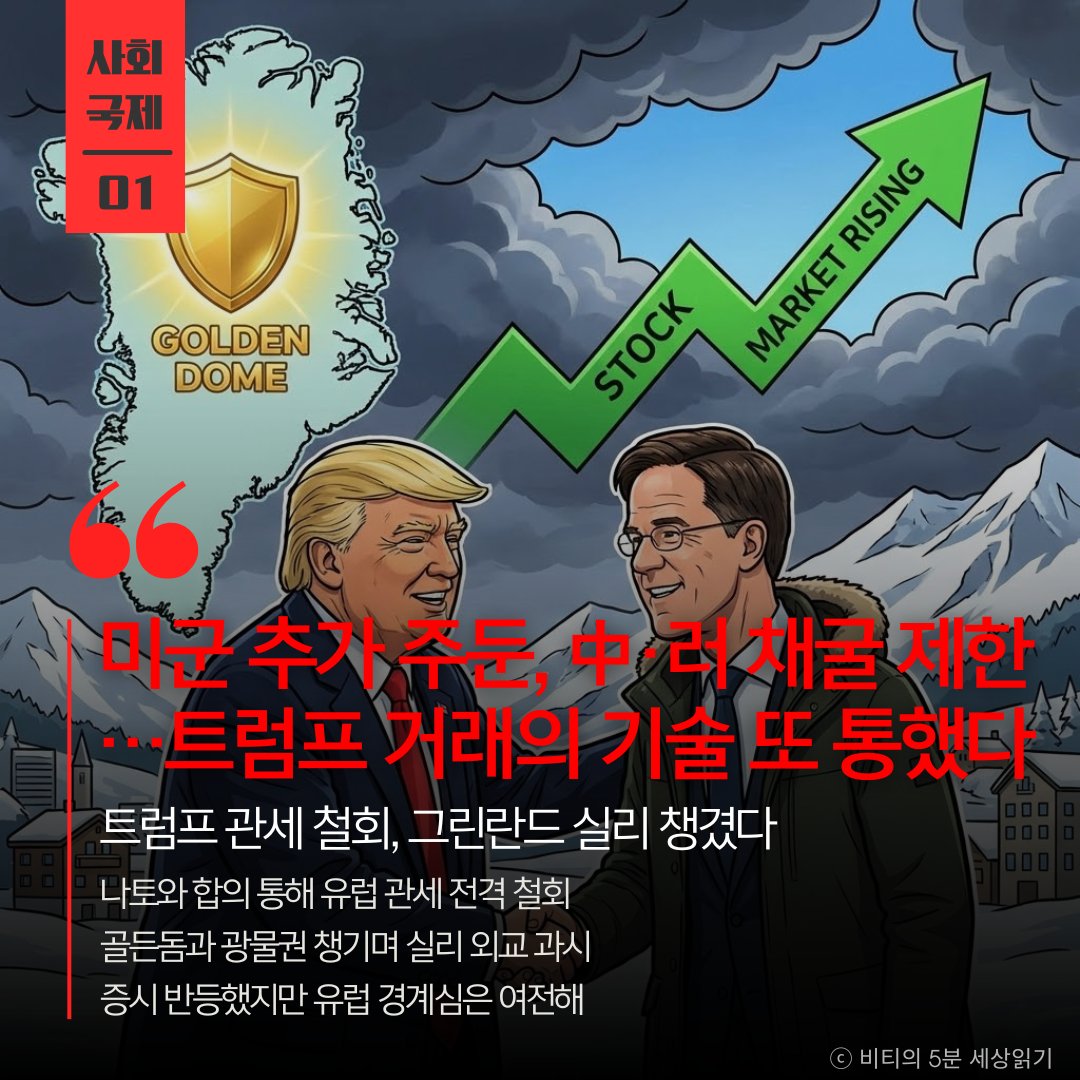 전형적인 '트럼프식 거래'의 진수입니다. '관세 폭탄'이라는 위기를 먼저 조성한 뒤, 이를 협상 카드로 써서 애초에 원했던 '군사적·경제적 실리(골든돔, 자원)'를 챙기는 방식이죠. 시장은 불확실성 해소에 환호했지만, 이것이 진정한 화해인지 아니면 더 큰 청구서를 내밀기 위한 숨 고르기인지는 두고 봐야겠습니다.