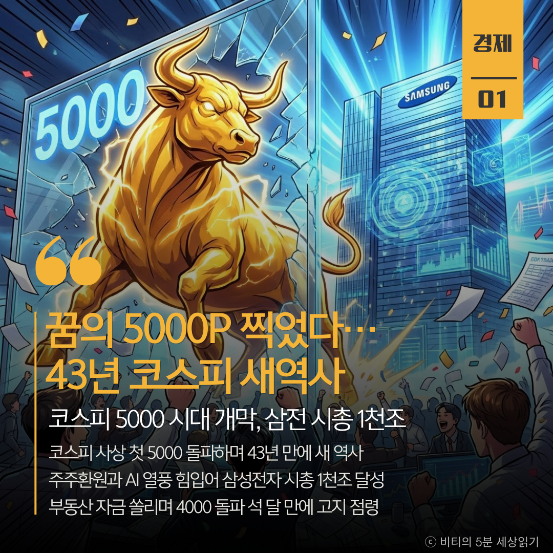 [26년 1월 23일(금)] 꿈의 5000P 찍었다…43년 코스피 새역사 - 비티의 오늘 주요 뉴스 요약