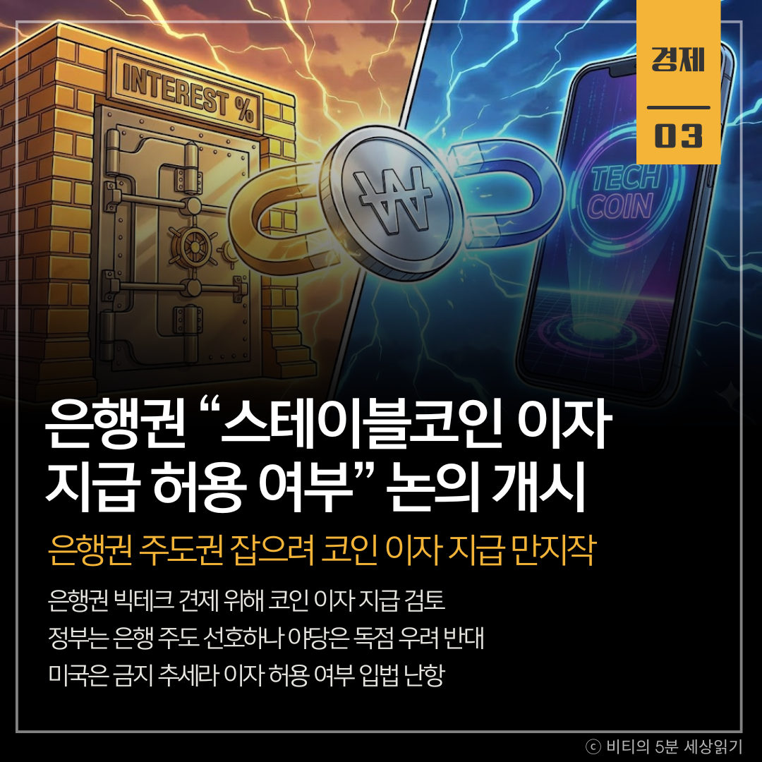 은행권이 테크 기업의 금융 시장 잠식을 막고 주도권을 확보하기 위해, 은행이 발행하는 '원화 스테이블코인'에 예금처럼 이자를 지급하는 파격적인 방안을 논의하고 있습니다.