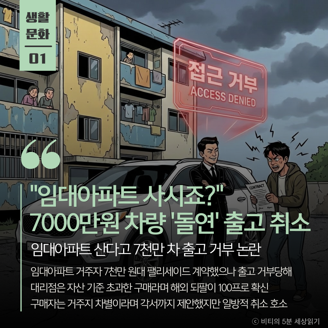 약 7000만 원에 달하는 고가 차량을 구매했지만 출고 당일 돌연 취소 통보를 받았다는 사연이 전해졌다. 구매자는 자신이 ‘임대아파트’에 거주한다는 이유로 부당 대우를 받았다는 입장이다.