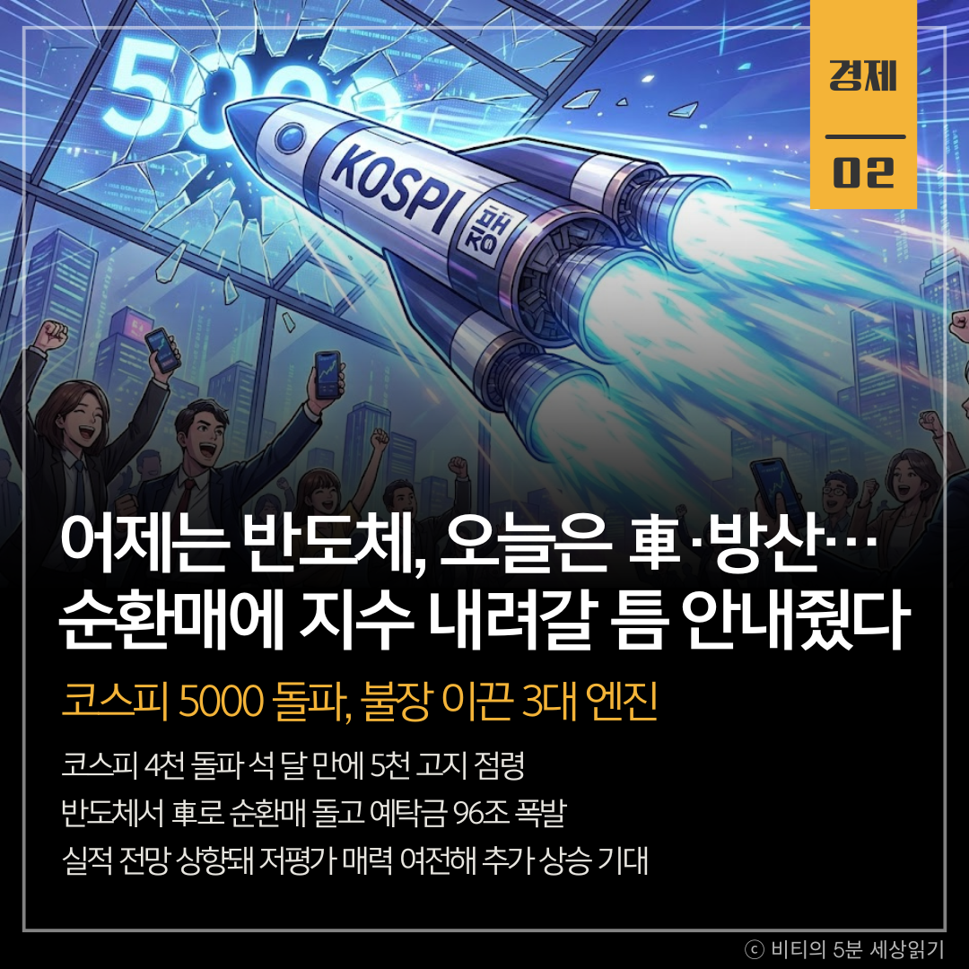 코스피가 사상 최초로 5,000선을 돌파한 가운데, 이를 견인한 3대 동력으로 대형주 중심의 '순환매', 96조 원에 달하는 '역대급 유동성', 실적 기반의 '저평가 매력'이 꼽혔습니다.