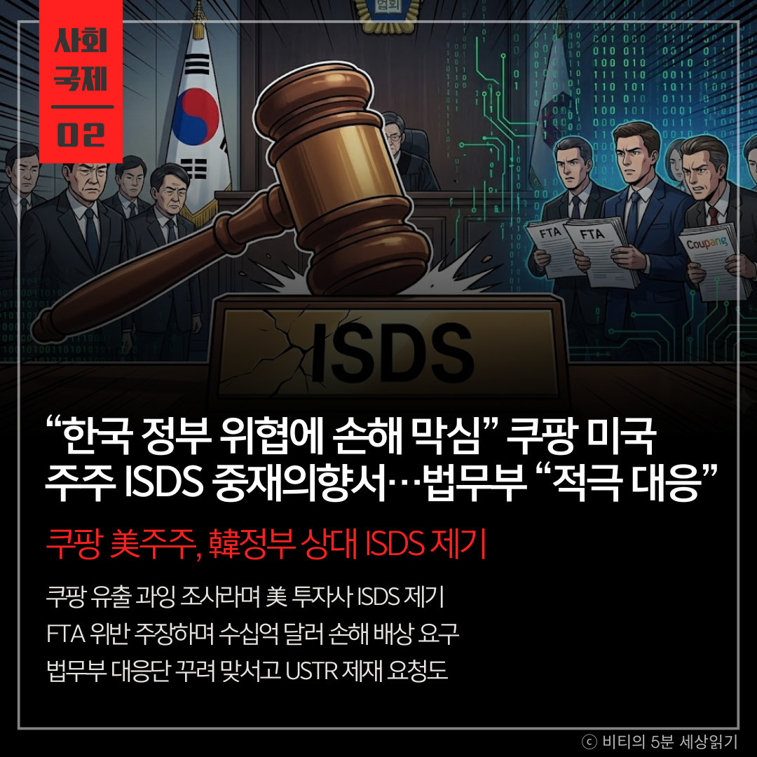쿠팡의 주요 주주인 미국의 그린옥스와 알티미터가 한국 정부를 상대로 ISDS 중재의향서를 냈습니다. 이들은 지난해 12월 쿠팡의 대규모 개인정보 유출 사고 이후, 국회와 정부가 진행한 고강도 진상조사와 행정 처분이 "쿠팡을 겨냥한 위협적인 조치"였다고 주장했습니다.