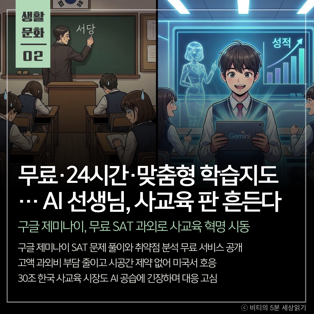 구글의 AI 챗봇 '제미나이'가 미국 대입 시험(SAT) 연습 서비스를 무료로 공개했습니다. 고액 과외 수준의 맞춤형 문제 풀이와 취약점 분석을 24시간 제공하며, 한국을 포함한 전 세계 사교육 시장에 거대한 지각변동을 예고하고 있습니다.