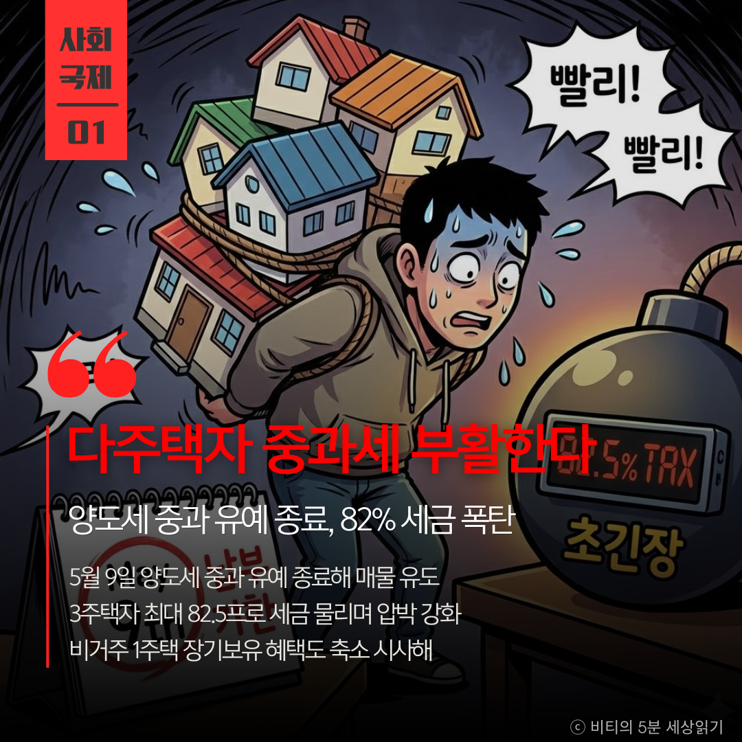이재명 대통령이 5월 9일 종료되는 다주택자 양도세 중과 유예 조치를 연장하지 않겠다고 못 박으며, 다주택자와 비거주 1주택자에 대한 전방위적 세금 압박을 예고했습니다.