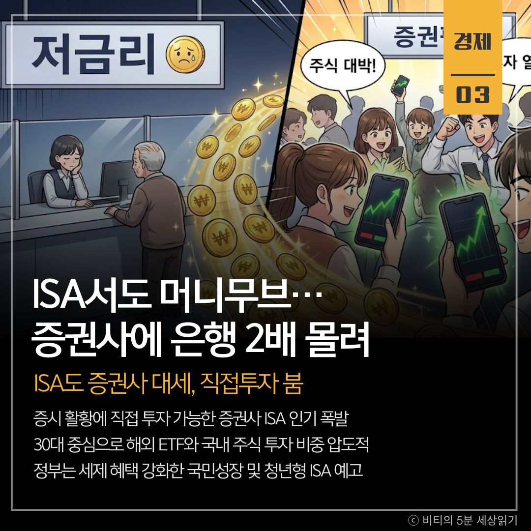 증시가 '불장'을 이어가면서 ISA 시장에서도 은행에서 증권사로 자금이 이동하는 '머니무브'가 가속화되고 있습니다. 지난해 11월 기준 증권사 ISA 투자금액은 약 30조 원으로 은행(16조 원)의 두 배에 달했습니다. 예·적금 위주의 은행 신탁형 상품보다, 개인이 직접 국내 주식이나 해외 ETF(상장지수펀드)를 골라 담을 수 있는 증권사 '중개형 ISA'에 대한 선호도가 급증했기 때문입니다.