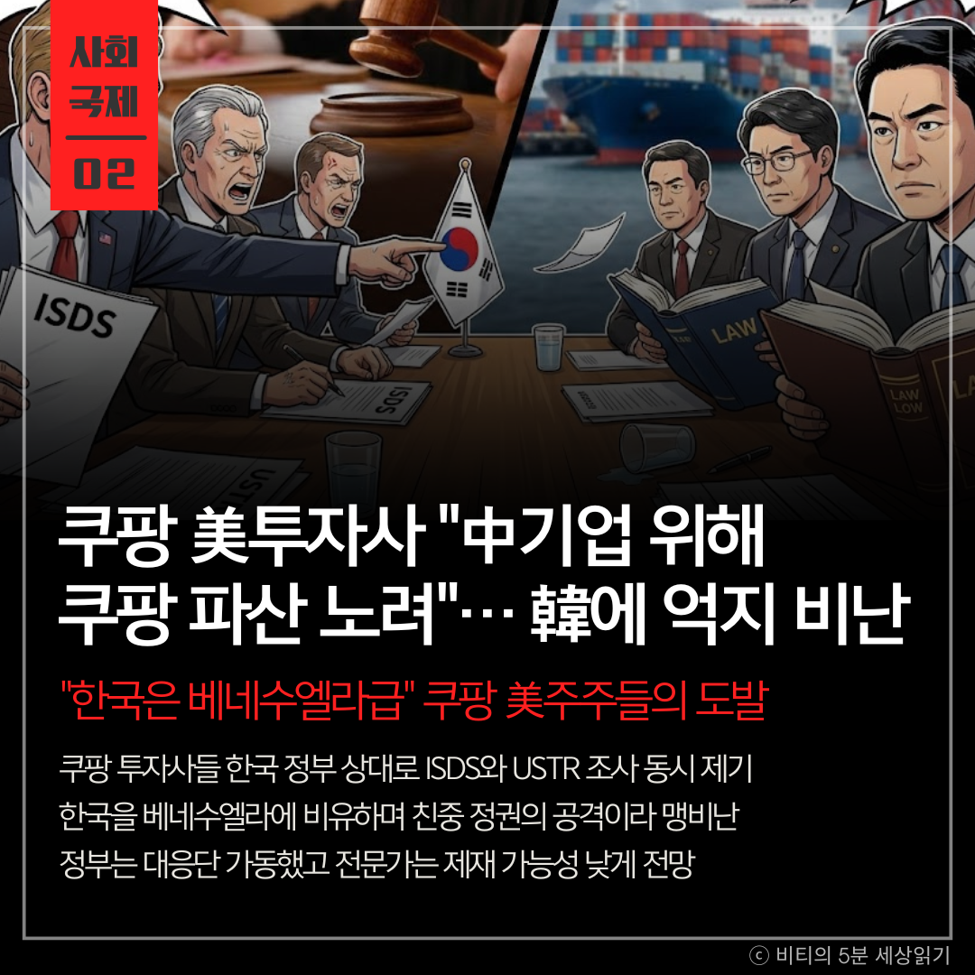쿠팡의 주요 주주인 그린오크스와 알티미터가 한국 정부를 상대로 '투트랙' 압박 작전을 개시했습니다. 이들은 한국 법무부에 ISDS 중재 의향서를 제출하는 동시에, 미 무역대표부(USTR)에는 무역법 301조 조사를 청원했습니다. 투자사들은 청원서에서 "한국 정부가 쿠팡을 처벌하기 위해 총출동했다"며 이를 베네수엘라나 러시아의 행태에 비유하고, 이재명 대통령과 여당을 '친중 성향'이라 공격하며 과격한 언사를 쏟아냈습니다.