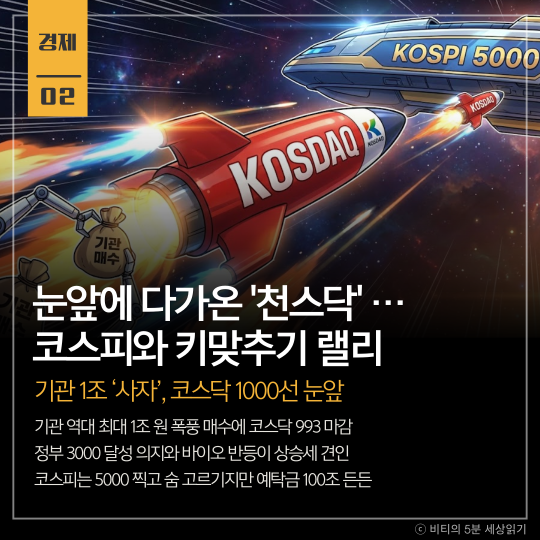 코스피 5000 시대에 소외됐던 코스닥이 기관의 역대 최대 규모(약 1조 원) 순매수에 힘입어 2.4% 급등, '천스닥(지수 1000)'을 눈앞에 뒀습니다. 정부의 코스닥 활성화 정책 기대감이 투자 심리에 불을 지폈습니다.