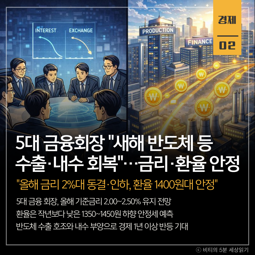 국내 5대 금융지주 회장들은 2026년 한국 경제가 완만한 반등세에 접어들 것으로 내다봤습니다. 기준금리는 현 수준(2.50%) 동결 또는 소폭 인하(2.00%)를 예상했으며, 원·달러 환율은 작년보다 다소 낮아진 1,350~1,450원 선에서 등락할 것으로 전망했습니다.