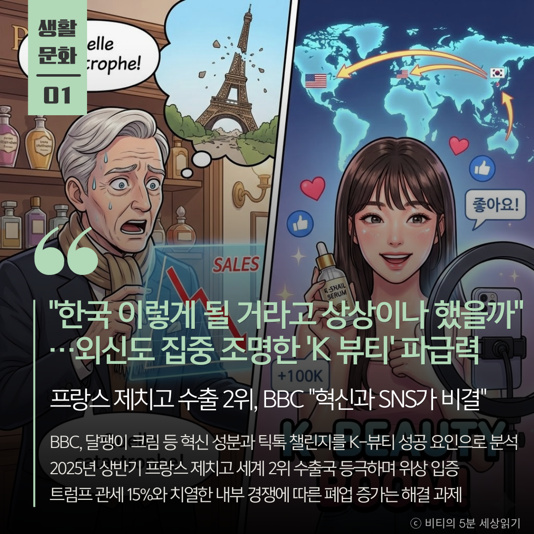 입소문으로 시작한 K-뷰티가 프랑스를 제치고 세계 2위 화장품 수출국(2025년 상반기 기준)에 등극했습니다. BBC는 달팽이 크림 등 혁신적인 성분과 틱톡 등 SNS를 통한 파급력을 성공 비결로 꼽으며, K-뷰티가 전 세계 스킨케어 문화를 주도하고 있다고 보도했습니다.