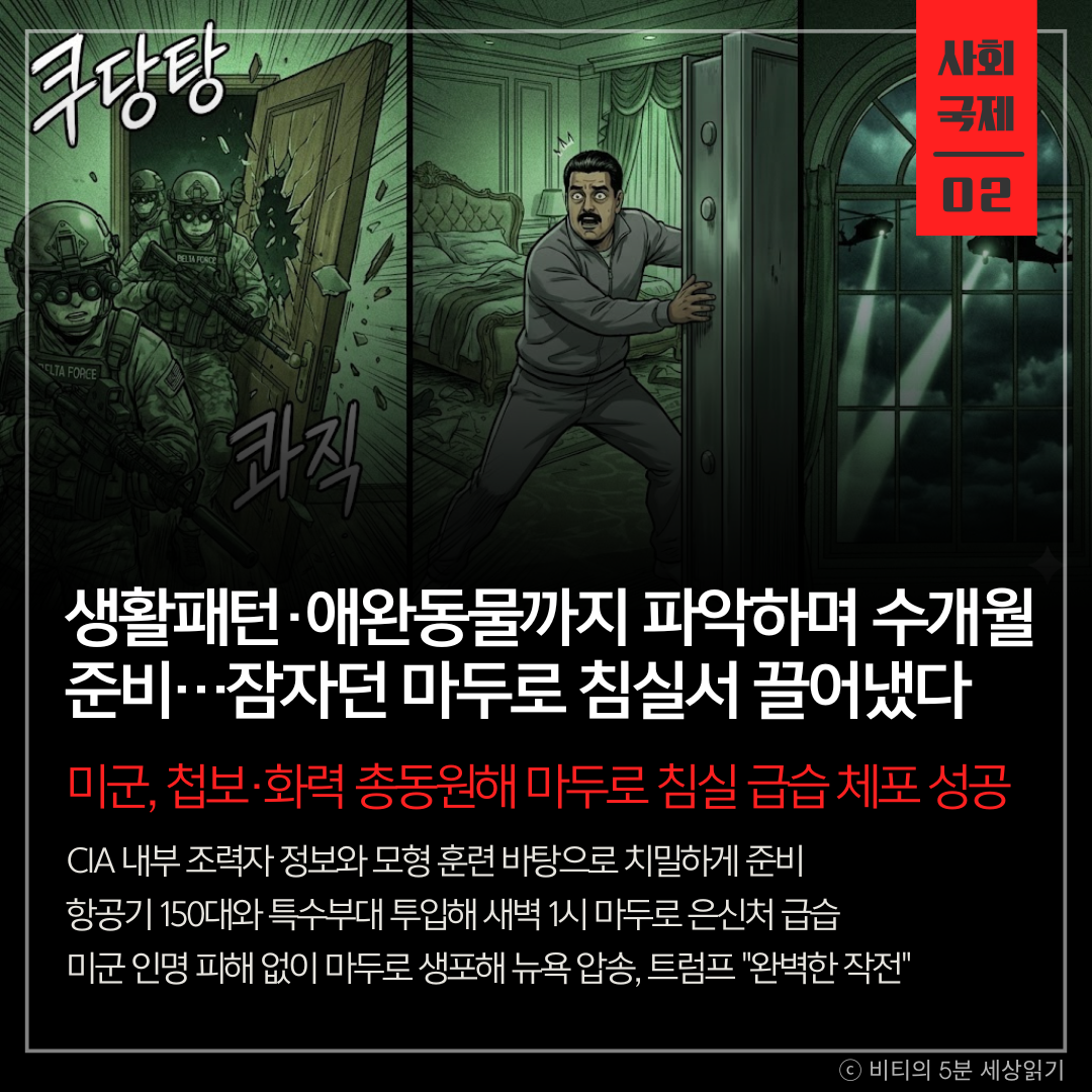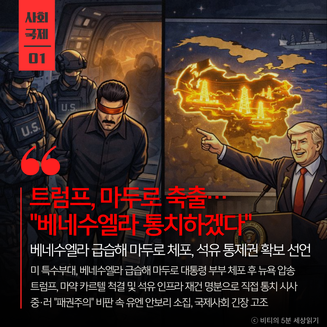 1. 3시간 만에 끝난 13년 독재 미군은 한밤중 기습 작전을 통해 마두로 대통령을 체포했습니다. 트럼프 대통령은 눈과 귀가 가려진 채 수갑을 차고 미 군함으로 이송되는 마두로의 사진을 직접 공개하며 작전 성공을 과시했습니다. 마두로 부부는 마약 유통 혐의로 뉴욕 구치소에 수감되었습니다.
