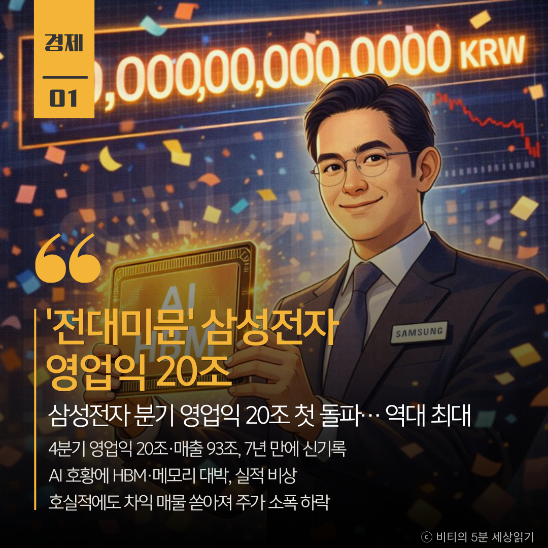 삼성전자가 AI 반도체 슈퍼사이클에 힘입어 국내 기업 사상 최초로 분기 영업이익 20조 원을 돌파했습니다. HBM3E의 본격적인 공급과 범용 메모리 가격 상승이 맞물리며 7년 만에 최대 실적을 갈아치웠습니다.